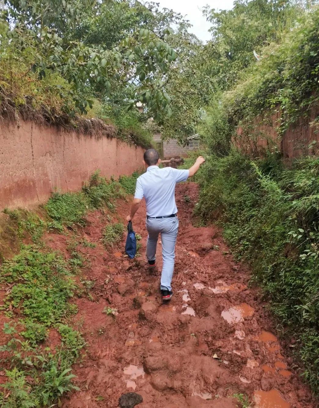 在这里,也有一个“悬崖”村。江滔经常上山下乡,偶尔与滑坡相遇,时常行走在悬崖峭壁之间,车子有时候过不去,他就和同事徒步翻山越岭。