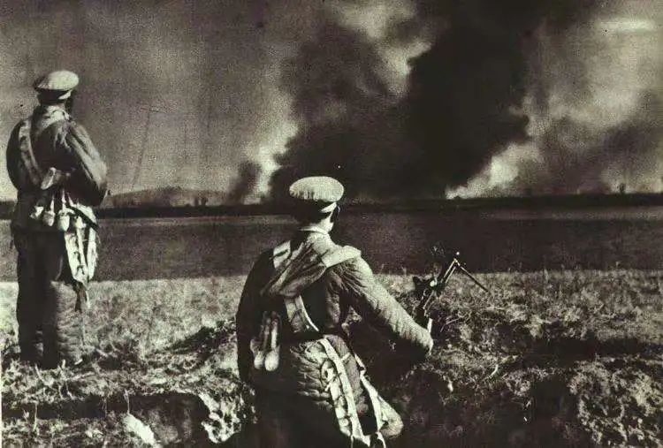 入朝前守卫在鸭绿江边的东北边防军战士,戴着大檐帽
