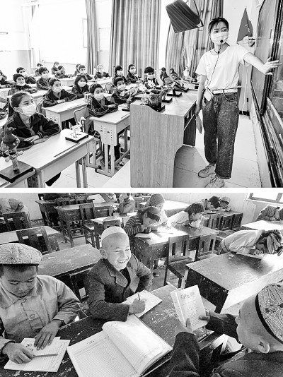 上图:2020年5月16日,在新疆和田县塔瓦库勒乡巴克墩小学,支教老师在给学生讲解科普知识。新华社记者 王菲摄