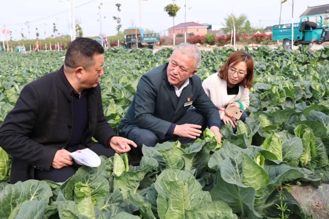 2020年4月14日,全国人大代表何健忠(中)在泰兴市分界镇腾兴村,查看村民种植的牛心甘蓝菜的生长情况。(何健忠供图)