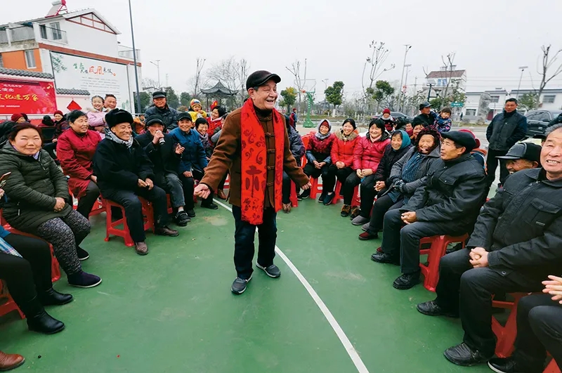 七旬老人陈斯琦退休前是安徽省全椒县文化馆馆长,从2012年开始,他在当地电视台开设《老陈说事》栏目,用方言结合当地实际给群众讲解党的方针政策、典型人物的模范事迹和社会的文明新风。图为陈斯琦在安徽省全椒县六镇镇小集村宣讲习近平新时代中国特色社会主义思想。人民图片 沈果/摄