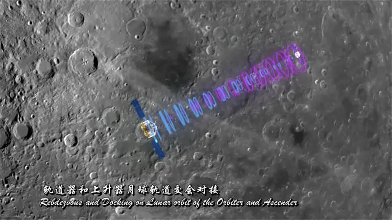 从上升器进入环月飞行轨道开始,通过远程导引和近程自主控制,轨道器和返回器组合体逐步靠近上升器,以抱爪的方式捕获上升器,完成交会对接。