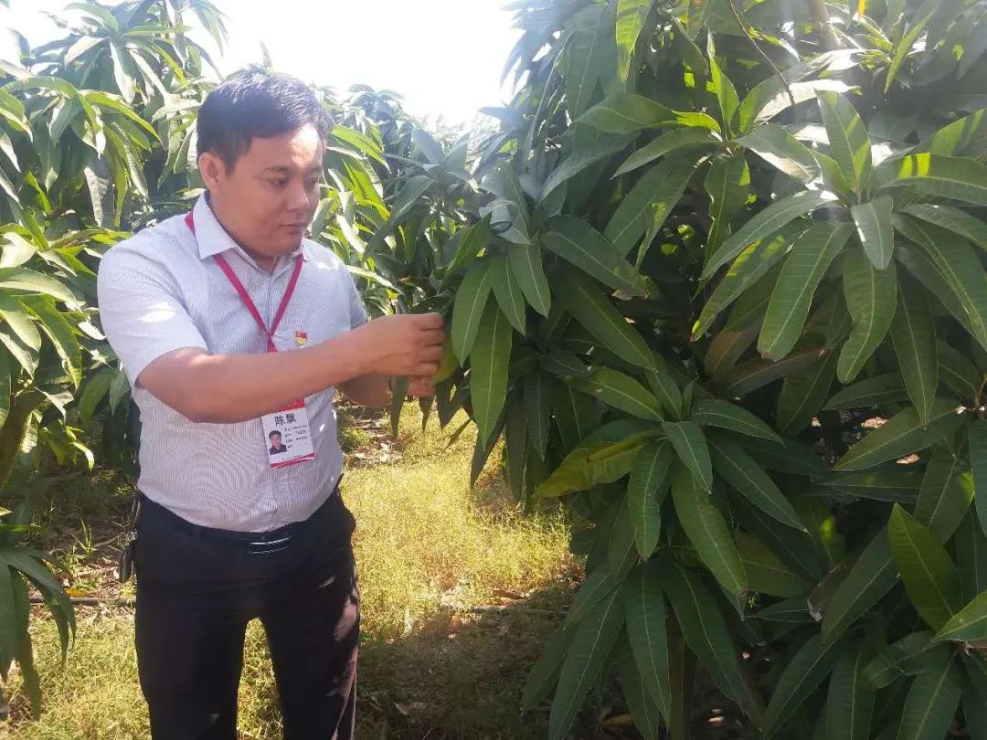 全国人大代表陈飘在母爸村的种植园查看芒果生长情况。(代表供图)
