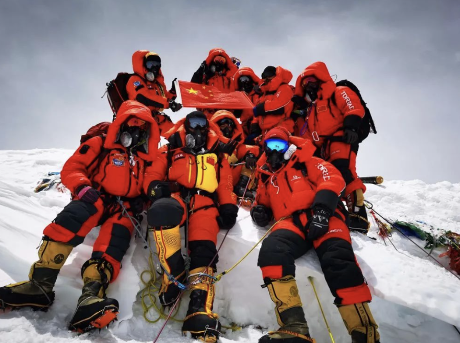 2020珠峰高程测量登山队在峰顶合影留念。(图/新华社)