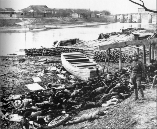 1937年底,进入南京的日军将中国军民送到下关江边以机枪扫射,尸体堆满了江边,惨不忍赌,行凶后的日军站在尸体旁,若无其事。