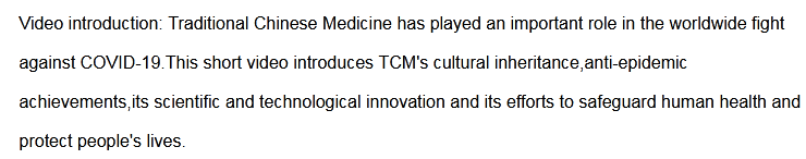 视频简介:在全球抗击新冠肺炎疫情中,中国的中医药发挥了重要的作用。该短视频从中医药的文化传承、抗疫成果、科技创新等方面,介绍了什么是“科学的中医药”以及中医药为人类的健康而付出的努力。