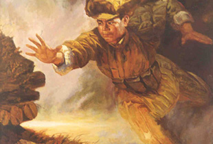 1952年10月,黄继光在上甘岭战役中,用自己的胸膛堵住了敌人的机枪眼,为战士们开辟了前进的道路。图为油画,表现的是黄继光在扑向机枪眼的一刻。