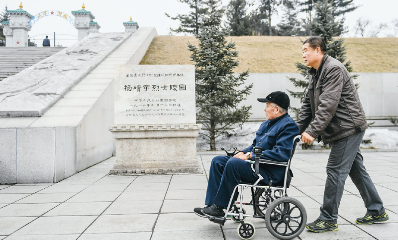徐振明是吉林省通化市革命烈士陵园管理所首任所长,现年95岁。他先后参加过抗日战争、解放战争,1950年参加抗美援朝战争,转战大江南北,经历战斗无数,曾荣立多次战功。他退伍转业到杨靖宇烈士陵园工作,父子两代默默守护英雄陵墓60余年,身体力行保护革命遗迹,讲述英雄故事,弘扬革命精神。图为徐振明(左)和儿子徐永军来到杨靖宇烈士陵园。 新华社记者 王昊飞/摄