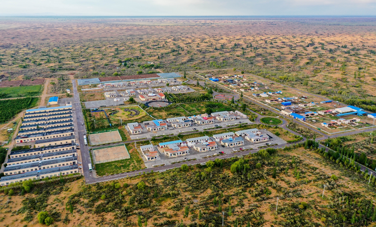 经过30多年治理,库布其沙漠林草综合植被盖度明显提高。在治理过程中,对沙漠腹地牧民的生态搬迁是一项重要工作。图为2020年9月14日,内蒙古鄂尔多斯市杭锦旗境内的道图嘎查牧民新村(无人机照片)。新华社记者 连振/摄