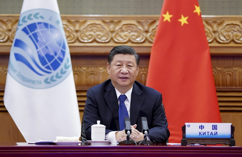 2020年11月10日晚,国家主席习近平在北京以视频方式出席上海合作组织成员国元首理事会第二十次会议并发表重要讲话。 新华社记者 李学仁 摄