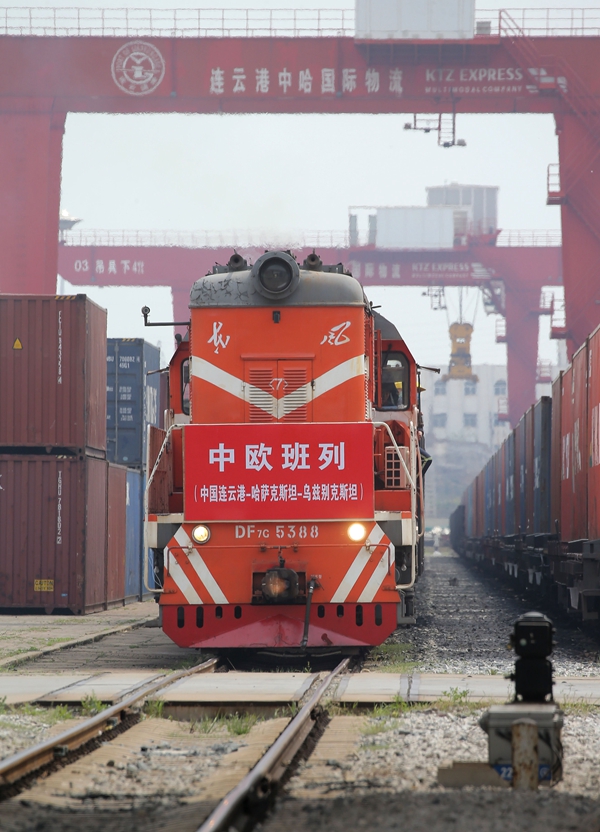 2020年4月14日,搭载着26万件防疫物资的中欧班列从中哈(连云港)物流合作基地出发,前往中亚国家。这批物资包括医用外科口罩、热成像仪、红外测温仪、防护服等,由上合组织(连云港)国际物流园、连云港港口控股集团共同捐赠给上海合作组织秘书处,助力相关成员国抗击新冠肺炎疫情。 新华社发(王健民 摄)