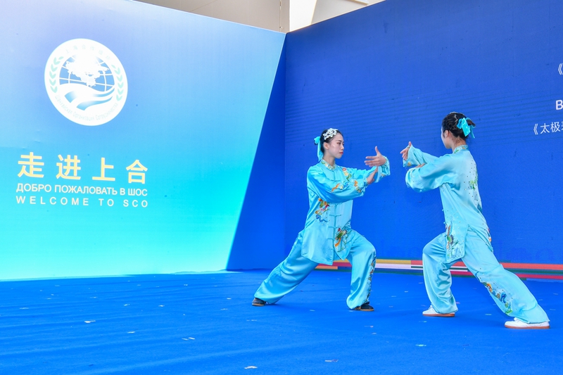 2020年10月18日,北京体育大学武术学院的学生在新闻发布会上表演太极。当日,上海合作组织秘书处在北京举行2020-2021年上合组织文化体育系列活动新闻发布会,介绍上合马拉松、上合拳击赛、上合瑜伽太极日等文化体育系列活动情况。 新华社记者 陈益宸 摄