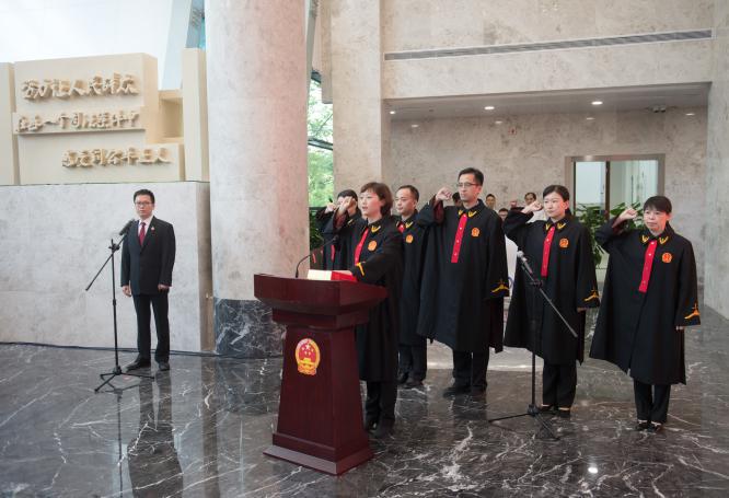 2017年8月18日,全国首家互联网法院在杭州成立。该法院定位于用互联网方式审理互联网案件,当事人通过互联网,足不出户就能完成诉讼,实现“网上纠纷网上了”。图为互联网法院成立当日,法官们参加宪法宣誓仪式。新华社记者 翁忻旸/摄