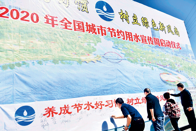 党的十八大以来,机关事务部门建立健全党政机关厉行节约制度体系和标准体系,组织开展节约型公共机构示范单位创建,推动机关运行成本进一步降低,在全社会发挥了示范引领作用。图为2020年5月12日,在江苏省如皋市全国城市节约用水宣传周启动现场,市民在“养成节水好习惯,树立绿色新风尚”条幅上签字。 视觉中国供图