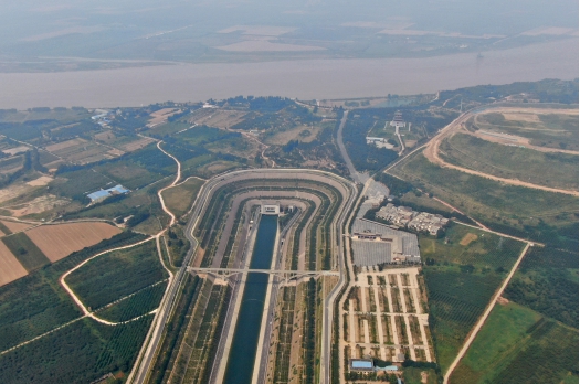 南水北调穿黄工程位于黄河南岸的河南郑州荥阳市和北岸的河南焦作温县境内,是南水北调中线总干渠穿越黄河的关键性工程,主要任务是安全有效地将中线调水从黄河南岸输送到黄河北岸。图为2020年9月15日,在河南郑州荥阳市境内拍摄的南水北调穿黄隧洞进口南岸明渠(无人机照片)。新华社记者 郝源/摄