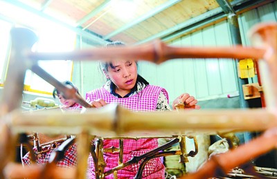 大关县旭红种养殖农民专业合作社车间,工人在制作筇竹制品。余兆宇摄/光明图片