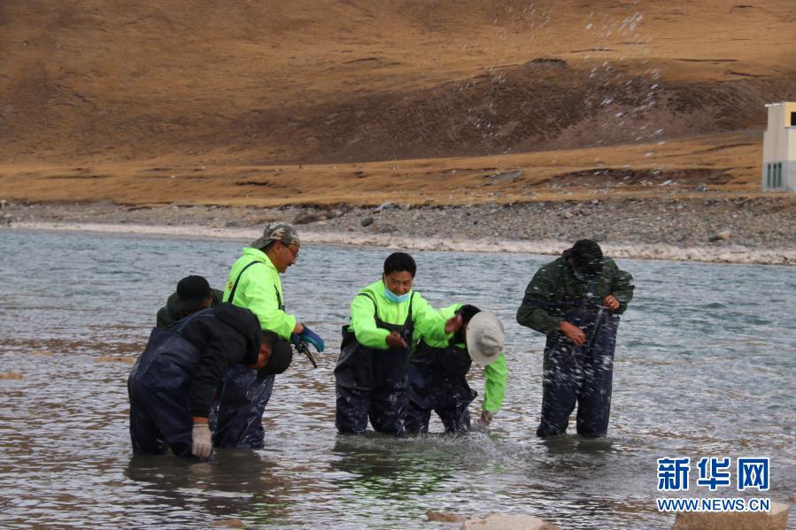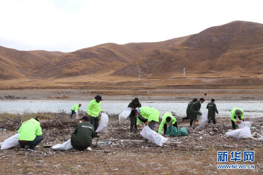 三江源国家公园治多生态环保协会的志愿者在清理河道内的垃圾(7月11日摄)。新华社发