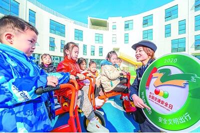 12月1日,江苏省海安市公安局交警向幼儿园孩子们宣传交通安全。新华社发