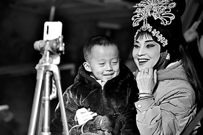 “送戏下乡”活动中,演员和农村小朋友一起进行网络直播。新华社发