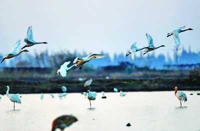 12月21日,天鹅等候鸟在南昌五星白鹤保护小区上空飞翔。新华社发