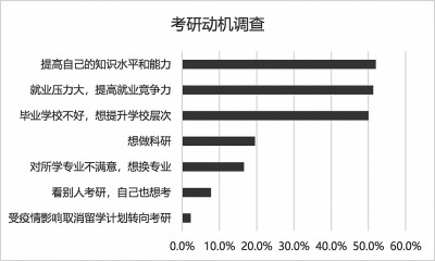 通过对考研动机的调查分析,超过半数考生读研目的是为了提升自身的知识水平和能力,以及由于就业压力大,提高就业竞争力;认为毕业学校不好,想提升学校层次为另外一个重要因素。此外,受疫情因素影响导致出国留学受阻转向国内考研成为新的考研动因。