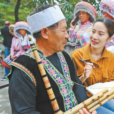 普法志愿者在重庆万盛经开区田坝村为苗族群众讲解法律知识。