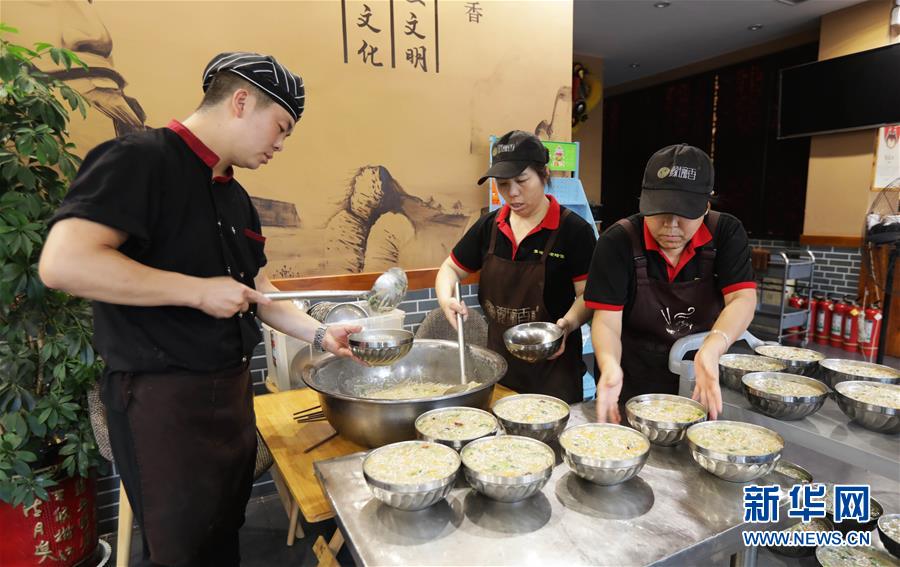 8月5日,面馆服务员为前来就餐的环卫工人准备“爱心面”。 在河南省焦作市武陟县,有一家面馆,连续三年为当地环卫工人提供午餐“爱心面”。 今年37岁的王海燕是这家面馆的负责人。2017年,她和县城环卫部门联系对接,商定把面馆当作环卫工人喝水、歇脚的“爱心驿站”,并于每周三免费为环卫工人提供“爱心面”午餐,关爱环卫工人。 新华社发(冯小敏 摄)