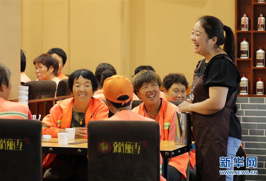 8月5日,王海燕(右一)和前来就餐的环卫工人聊天。 在河南省焦作市武陟县,有一家面馆,连续三年为当地环卫工人提供午餐“爱心面”。 今年37岁的王海燕是这家面馆的负责人。2017年,她和县城环卫部门联系对接,商定把面馆当作环卫工人喝水、歇脚的“爱心驿站”,并于每周三免费为环卫工人提供“爱心面”午餐,关爱环卫工人。 新华社发(冯小敏 摄)