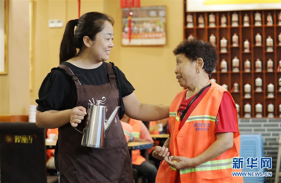 8月5日,王海燕(左)和前来就餐的环卫工人聊天。 在河南省焦作市武陟县,有一家面馆,连续三年为当地环卫工人提供午餐“爱心面”。 今年37岁的王海燕是这家面馆的负责人。2017年,她和县城环卫部门联系对接,商定把面馆当作环卫工人喝水、歇脚的“爱心驿站”,并于每周三免费为环卫工人提供“爱心面”午餐,关爱环卫工人。 新华社发(冯小敏 摄)