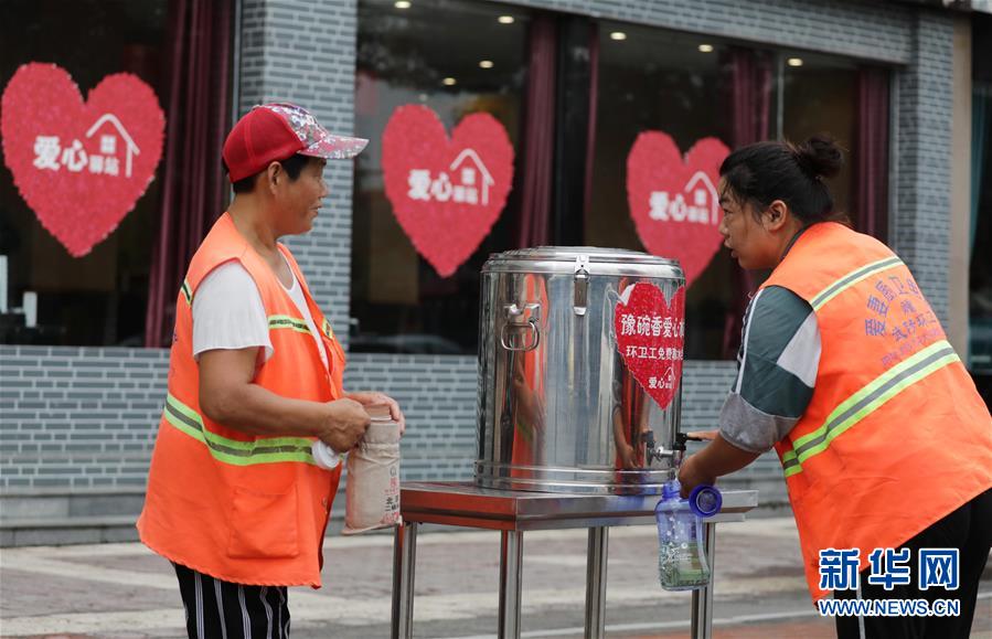 8月5日,环卫工人在面馆准备的免费取水点接水。 在河南省焦作市武陟县,有一家面馆,连续三年为当地环卫工人提供午餐“爱心面”。 今年37岁的王海燕是这家面馆的负责人。2017年,她和县城环卫部门联系对接,商定把面馆当作环卫工人喝水、歇脚的“爱心驿站”,并于每周三免费为环卫工人提供“爱心面”午餐,关爱环卫工人。 新华社发(冯小敏 摄)