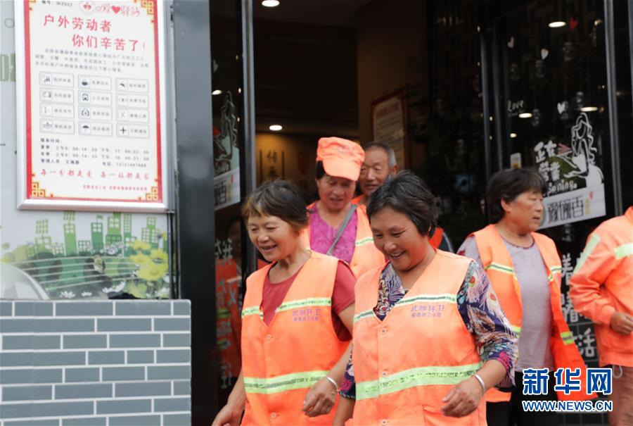 8月5日,午饭结束后,环卫工人走出面馆。 在河南省焦作市武陟县,有一家面馆,连续三年为当地环卫工人提供午餐“爱心面”。 今年37岁的王海燕是这家面馆的负责人。2017年,她和县城环卫部门联系对接,商定把面馆当作环卫工人喝水、歇脚的“爱心驿站”,并于每周三免费为环卫工人提供“爱心面”午餐,关爱环卫工人。 新华社发(冯小敏 摄)
