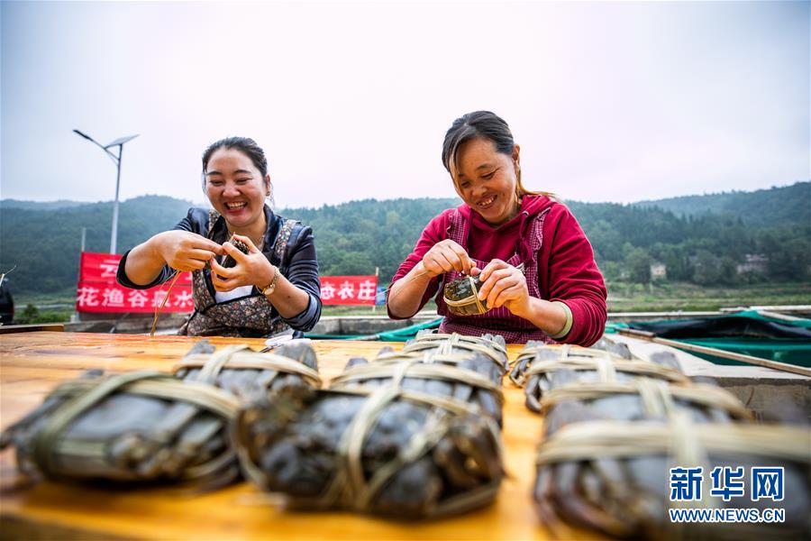 9月24日,村民在贵州省毕节市七星关区清水铺镇后山社区大闸蟹养殖基地里绑扎大闸蟹。新华社发(罗大富 摄)