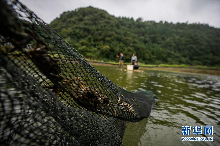 9月24日,村民在贵州省毕节市七星关区清水铺镇后山社区大闸蟹养殖基地里捕捞大闸蟹。新华社发(罗大富 摄)