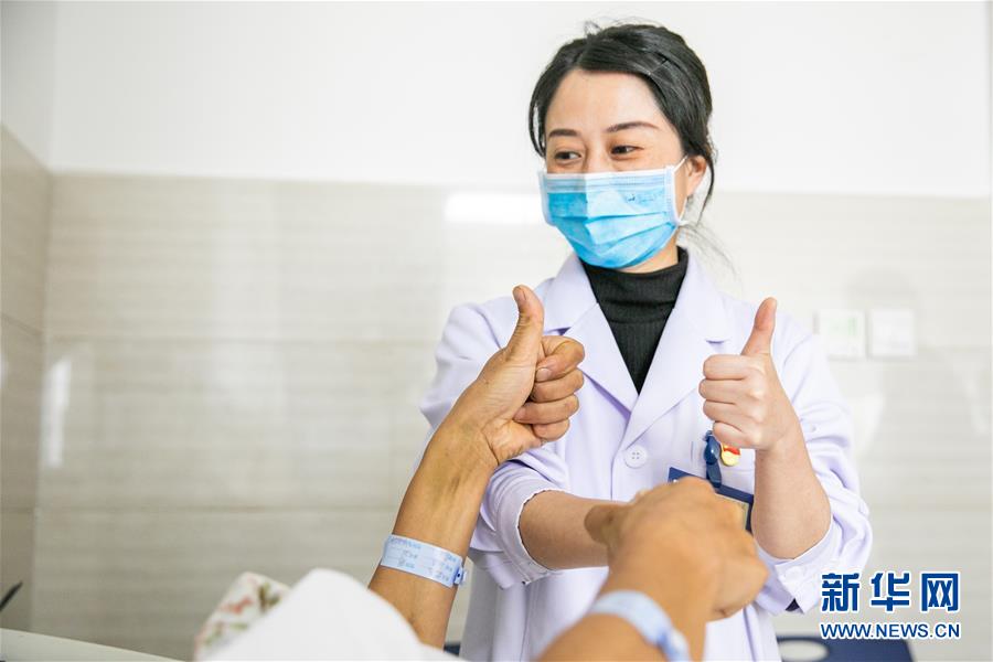 10月10日,吉丹丹在贵州省毕节市第一人民医院看望从重症医学科转到普外科的患者,并鼓励其配合治疗,早日出院。