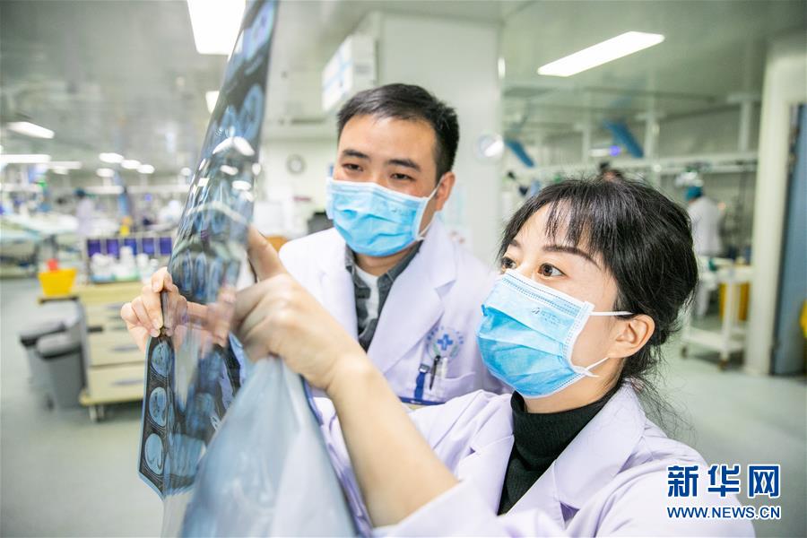 10月9日,吉丹丹(右)在贵州省毕节市第一人民医院重症医学科和同事讨论患者病情。 新华社发(罗大富 摄)
