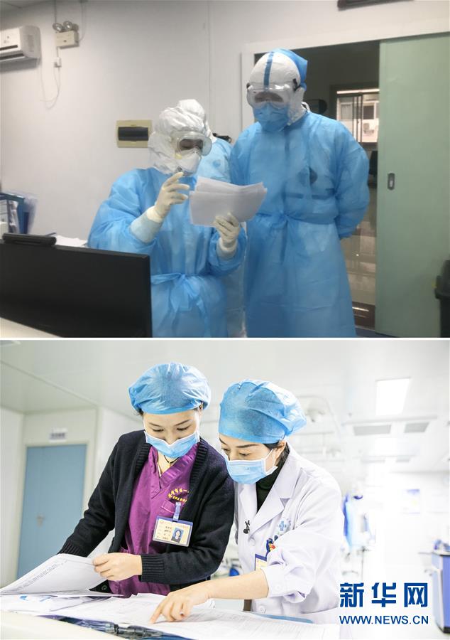 这是一张拼版照片:上图为2月4日,在湖北省鄂州市中心医院呼吸与危重症医学科病房,吉丹丹(左)在和同事傅小云讨论患者病情(受访者供图);下图为10月9日,在贵州省毕节市第一人民医院重症医学科,吉丹丹(右)和护士康晓迪讨论患者治疗方案(罗大富 摄)。 新华社发