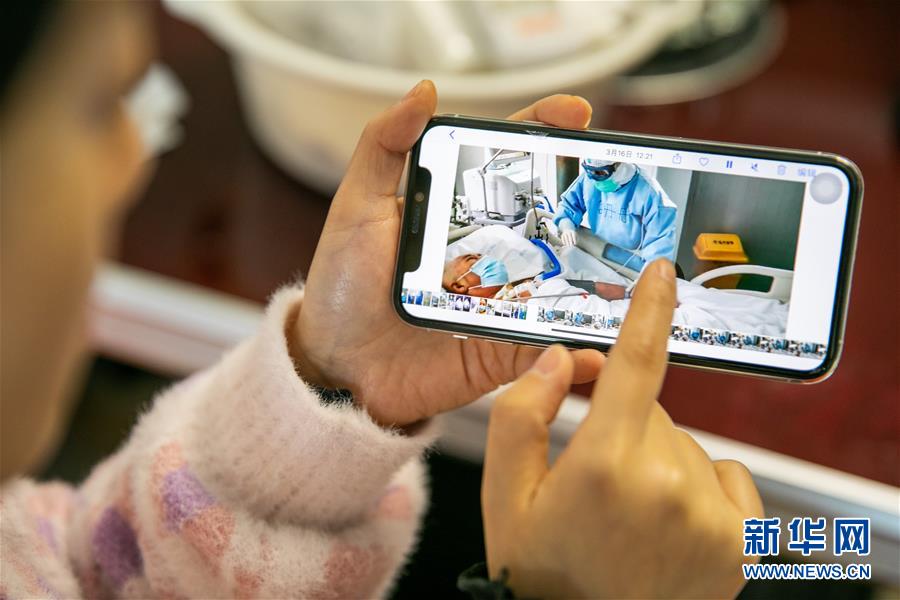 10月10日,吉丹丹在贵州省毕节市七星关区的家里翻看自己在鄂州市中心医院的工作照。 新华社发(罗大富 摄)