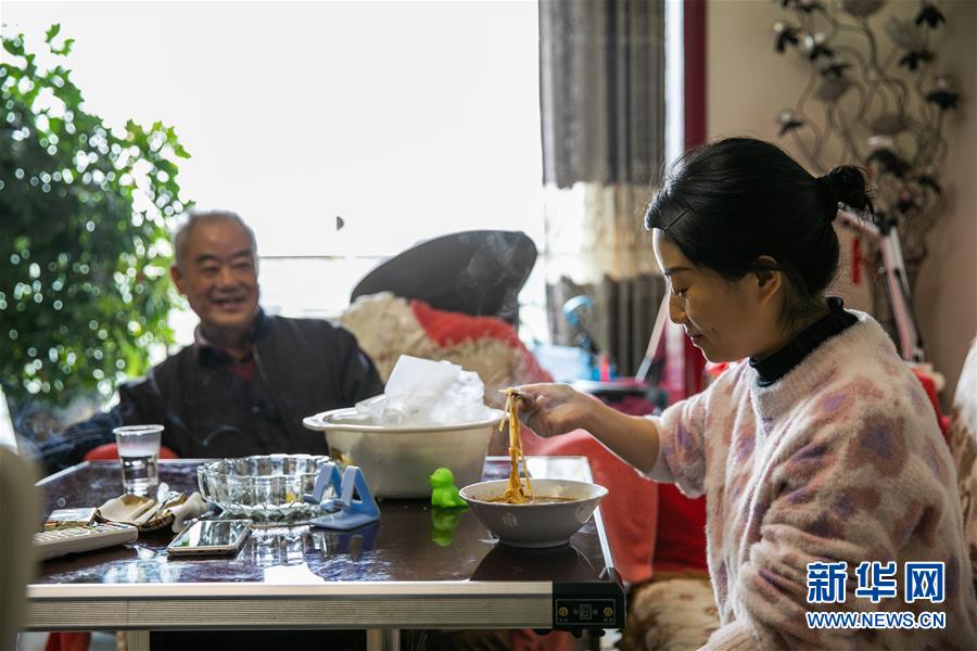 10月10日,在位于贵州省毕节市七星关区的家里,下班后的吉丹丹吃着妈妈煮的面条。 新华社发(罗大富 摄)