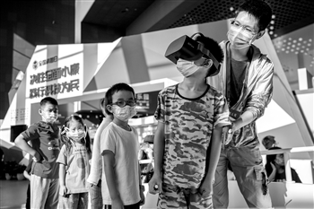 图为9月19日,小朋友们正在排队体验一家科技公司的VR智能设备。