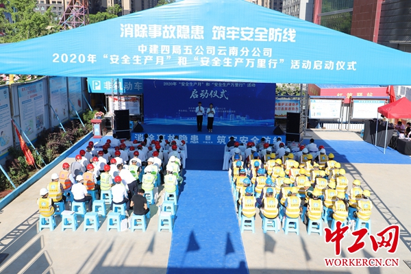中工网讯(中工网记者黄榆 通讯员翟明杰代科)6月5日,中建四局五公司云南分公司2020年“安全生产月”和“安全生产万里行”活动启动仪式,在云南省第四、昆明市呈贡区第一高楼七彩第壹城超高层双子塔项目举行。工友代表等共计100余人参加。