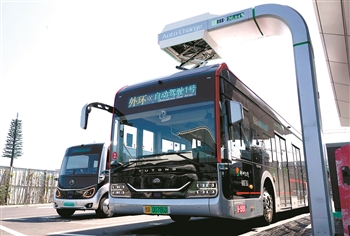 上图:郑州市郑东新区自动驾驶公交1号线车辆在场站内充电(8月18日摄)。