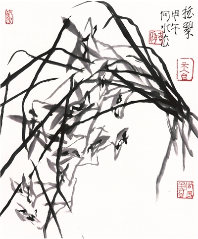他的花鸟画作品题材广泛、技法娴熟、内涵丰富,蕴含着蓬勃旺盛的生命力。因为热爱生活、细心观察,他的花卉在选材上也十分新颖而特别。他专挑一串红、迎春花、紫藤等一些小叶子小花的花卉或花树画。在画牡丹、荷花这类本来大花大叶的花卉时,则把整张的墨叶散成无数水墨的短线或小块,而每个小块都由具复杂墨象和笔路的笔墨构成。因此,在何水法的作品中,总是自带繁杂的细节与人性的温度,画面有序而灵动,细节巧妙而耐看。