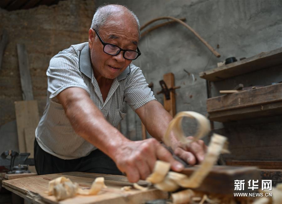 8月12日,在福建省龙岩市长汀县新桥镇新桥村,李石水在刨一块废旧木板准备制作玩具。 新华社记者 宋为伟 摄