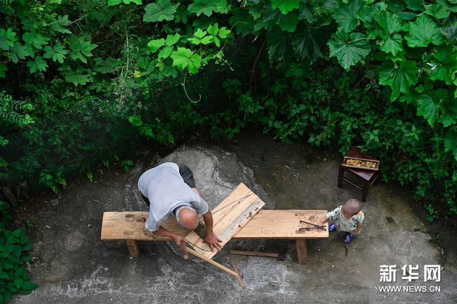 8月12日,在福建省龙岩市长汀县新桥镇新桥村,李石水的孙子蛋蛋看着爷爷按照划线锯开木板。 新华社记者 宋为伟 摄