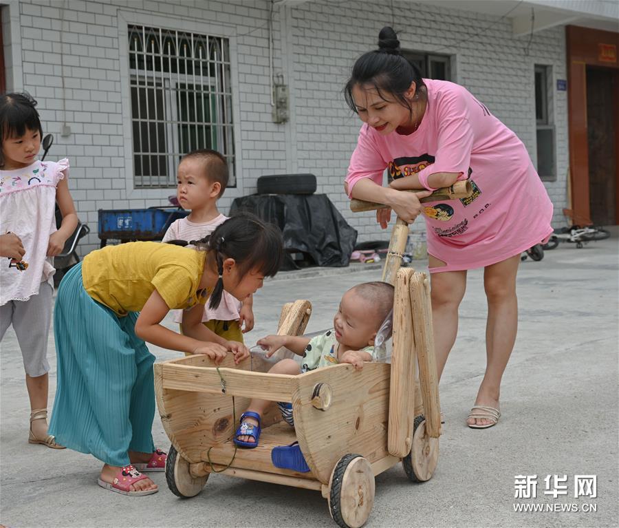 8月12日,在福建省龙岩市长汀县新桥镇新桥村,李石水的儿媳黄凤杏用“螳螂车”推着蛋蛋出行,吸引了同村小朋友围观。新华社记者 宋为伟 摄