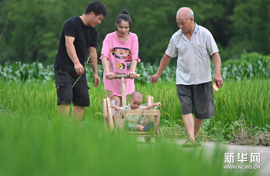 8月12日,在福建省龙岩市长汀县新桥镇新桥村,李石水(右)和儿子李跃金(左)、儿媳黄凤杏推着蛋蛋乘坐“螳螂车”散步。新华社记者 宋为伟 摄