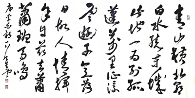 我们赏读吉庆的书作,首先感受到的是一种不落俗套的风韵,同时又可明显觉察到祝书的信息片段的存在,其用笔含蓄内敛,既有流畅之美,又具沉稳之力;字法轻松随意,又不张扬。往往整幅作品气韵流畅,有一种大河流淌的旋律,但又能感觉到不平坦的河床和不时出现的水漩,给人以遐想的空间。他的书法基本形成了自己的面貌,并为自己开创了一片艺术园地。对此,吉庆很坦然,他不在乎别人怎么评说,他认定这是一条书法正道,艺术最忌随大流啊!在这一点,我真心为吉庆叫好!