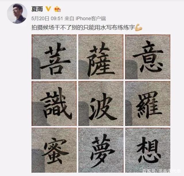 众所周知,在当今影视圈里有着很多酷爱书法的影视工作者(当然,也可以说成是影视明星)。老一辈的艺术家我们就暂且不说了,大多书法功力深厚,今天我们要说的则是拍戏之余也不忘练字的书法爱好者——夏雨。其书法艺术,在青年一代的影视人员中,可以说是非常优秀了,说他是佼佼者也不为过。