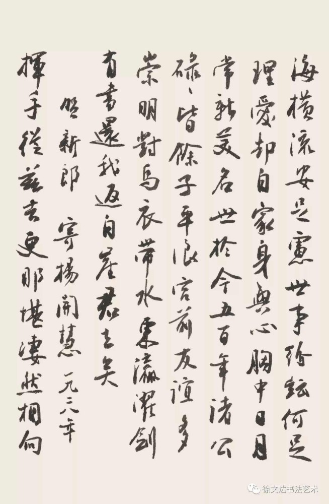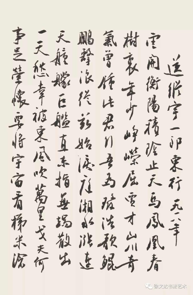 先生从小受正统儒家精神浸淫,一生视传统为根。初从“二王”入手,继对黄庭坚、苏东坡下过一番工夫,又取北碑雄浑,篆隶之朴茂。中年之后深受清代傅山影响,书风变,然骨法用笔,渐趋凝重,其书风磅礴大气,率意奔放。他晚年草书将音乐、绘画、诗词意境的理解和笔墨技巧揉到草书创作中,传统草书的研究和创作进入了一个新的境界。他将多种不同门类艺术碰撞,展现出一种的雅逸疏淡草书美呈现在世人的眼前,虽学古但非泥古,这就是徐先生作品与他人不同之处。