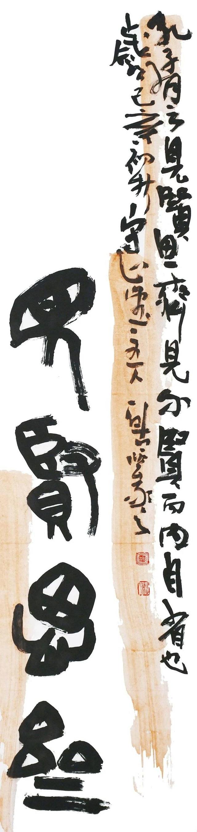石古在书法方面的研学则得益于其书法导师蔡先金,掐指算来已有30余载。蔡先生是著名书法家丛文俊先生的高足,有名师的常年教诲,石古对真、草、隶、篆多种书体皆有研究并游刃有余,尤善篆隶,大字恢弘豪迈、铿锵有力,小字线条饱满、笔笔到位,多书自家诗文,且常有画意寓于书法结构之中。他每在画上题诗作文,辄能收到画龙点睛、相得益彰的效果。